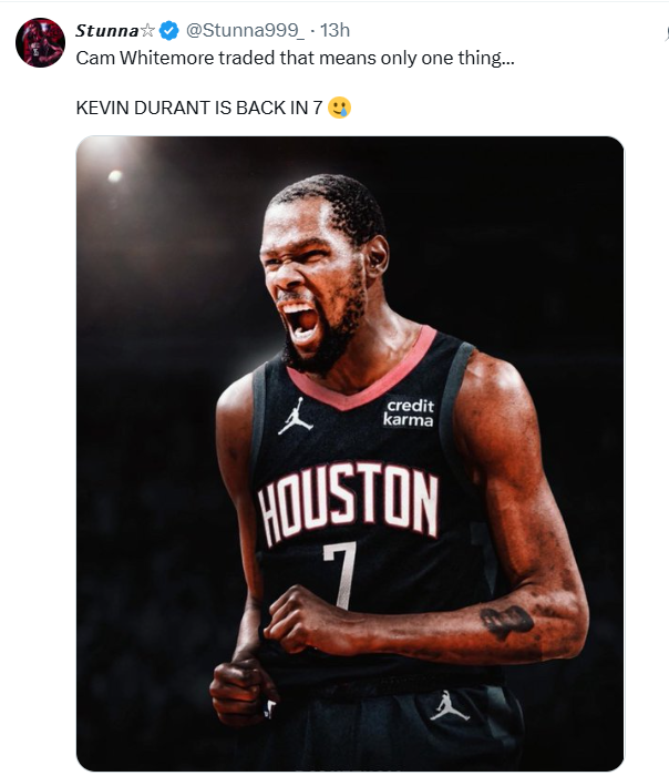 雷速体育7月6日讯 美媒Stunna今天发推文,惠特莫尔被交易至奇才,意味着一件事,那就是杜兰特有机会重新在火箭穿回7号球衣。